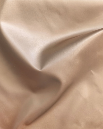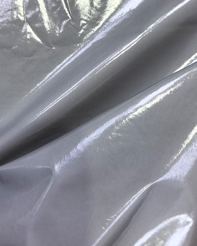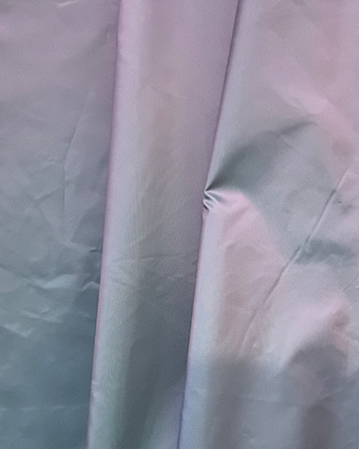 经纬采用20D细旦纱线,经向尼龙,纬向涤纶,背面做发泡涂层处理,如同给面料注入了空气感,具有肉感和亲肤感,独特的幻彩双色外观而脱颖而出,赋予了面料动态的视觉魅力,在不同光线和角度下呈现出微妙而丰富的光泽变化,机具时尚感